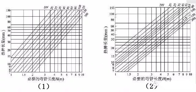 為簡(jiǎn)化計(jì)算,常用線算圖來(lái)確定L型補(bǔ)償器的短臂長(zhǎng)度和Z型補(bǔ)償器的中間臂長(zhǎng)度。圖二(1)是L型彎管段自然補(bǔ)償線算圖,(2)是Z型彎管段自然補(bǔ)償線算圖。